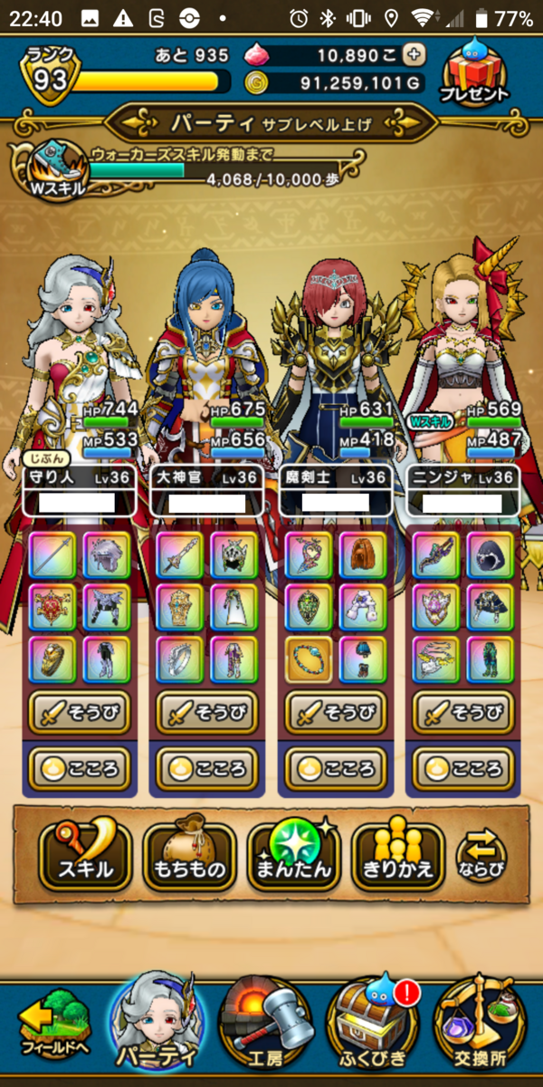 例えば、私のパーティーでは、現在のレベリング用武器の組み合わせは「鎧の魔槍」「カルベロビュート」「メタルキングの剣「闇竜の牙」となっている。メタルキングの剣をゴールデンクレイモアに置き換えてしまえば、現在枠がなくて外している妖精の円月輪を編成に組み込むことができるようになる。