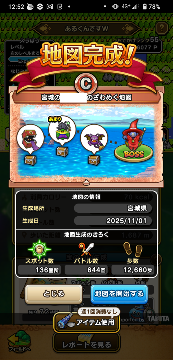 そして逆に、手元に残る記念として、宝の地図を現地で生成した。これが記念になるというのは、前回たまたま北海道でやって初めて分かった。地図の名前が「プレイヤー名+生成した場所」になり、生成した日時まで記録されるからだ。